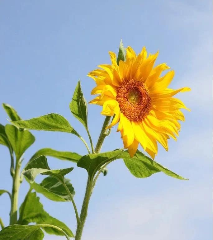 忽然,我眼前一亮,不遠(yuǎn)處竟然有一株盛開的向日葵花。 這株小小的向日葵,不過幾寸來高,它纖細(xì)的毛茸茸的莖桿上,撐開四片翠色透亮的嫩葉,頂上擎著的一朵小花正開得旺盛。宛如一株讓人心生愛憐的花兒。我一陣欣喜,不禁蹲下來凝神細(xì)看。金黃凝滑的花瓣,滾著幾滴晶瑩的露珠,如水洗過般光潔;嬌妍簇?fù)淼幕ㄈ?,纖弱柔美,亭亭玉立;涼風(fēng)拂過,花枝微顫,還能嗅到一抹淡淡的馨香。