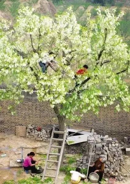 那時候,感覺槐花樹是低微的樹,就像那時候遍地的孩子都是散養(yǎng)的,自由生長,自由發(fā)揮,自由長高長壯。槐花樹便是長在村口,長在門前,長在屋后,長在小河邊,長在土堆上,長在無人問津的荒郊野外……總之無處不在地生長。靠自己頑強的性格和毅力生存下去,默默地經(jīng)受著風吹日曬,霜打雨淋。待到春天里,便開滿一樹一樹潔白成串兒一嘟嚕一嘟?;被āD菚r候的鄉(xiāng)親們也不稀罕槐花,因到處可見,因隨手可取。也因見多了,不足為奇槐花的美麗,覺得本就是這樣的樹就該開這樣的花。像辛勤的農(nóng)民,黃土地的身板,本該在黃土地上含辛茹苦地證實著自己的老實巴交。