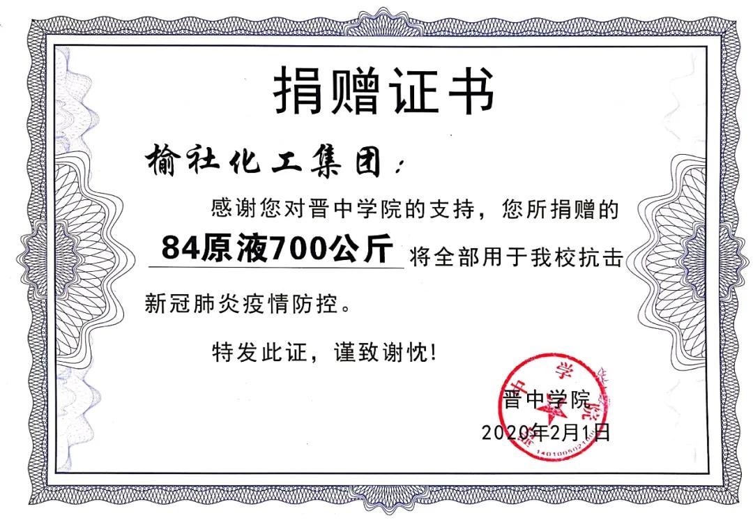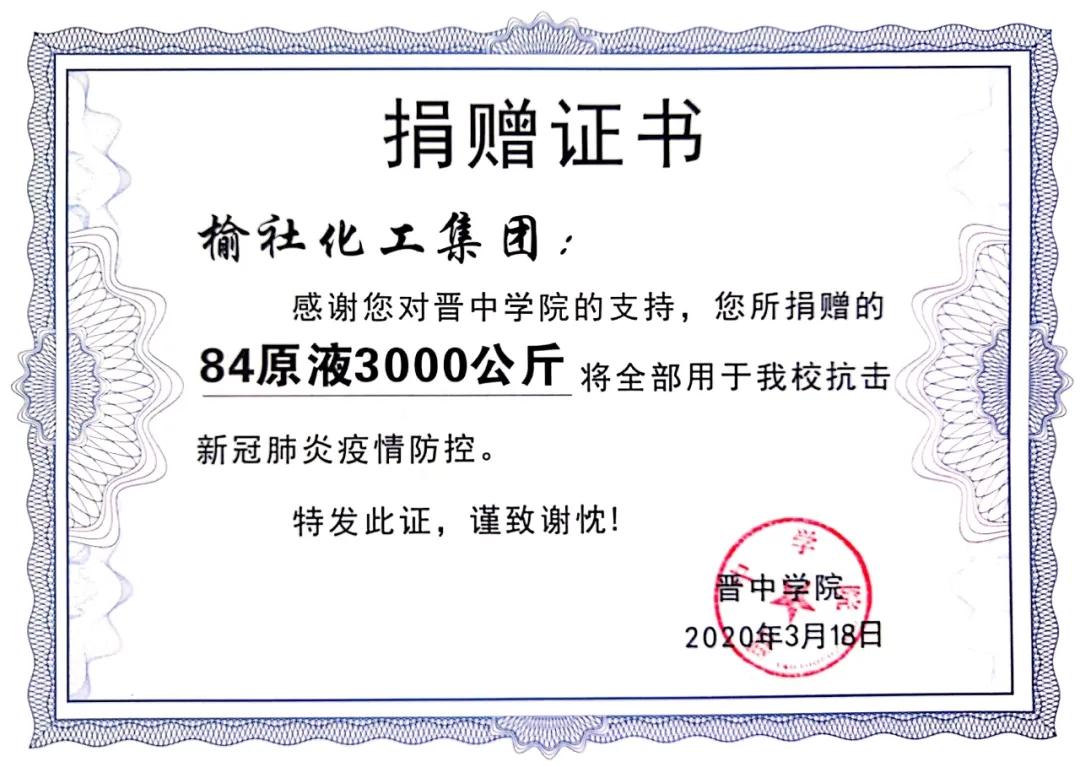 公司在疫情期間兩次為晉中學(xué)院捐贈次氯酸鈉消毒液