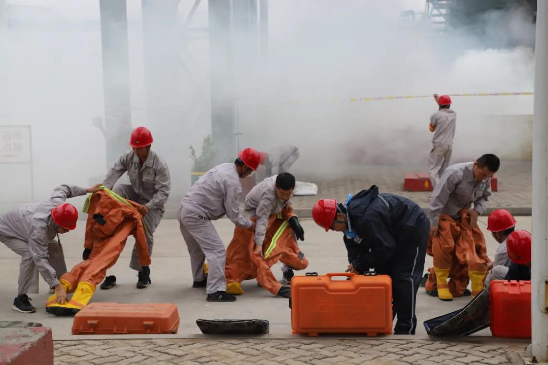 演練中,各廠領導高度重視,緊密結合生產(chǎn)實際,從實戰(zhàn)出發(fā)制定了事故演練方案,精心組織安排開展預案演練。參與人員認真負責,各司其職,規(guī)范佩戴勞動防護用品,積極進行搶險救援。從事故發(fā)生、事故上報、人員疏散、安全警戒、傷員搜救、搶險搶修、環(huán)境檢測等一直到善后處置均有條不紊的進行。